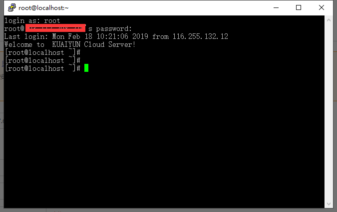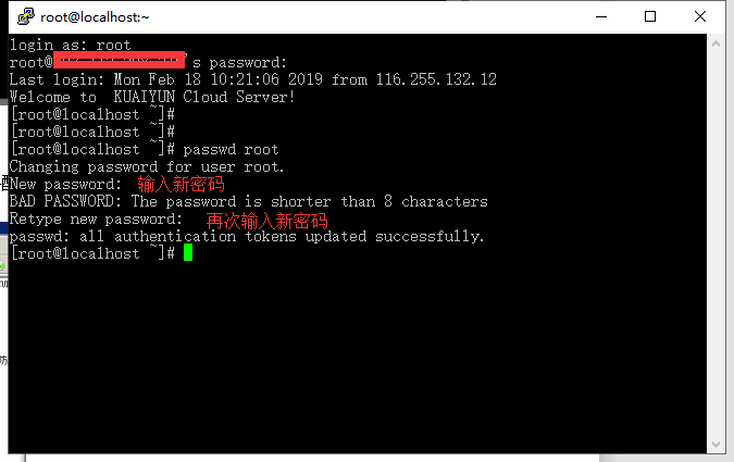 输入“exit”或者“logout”退出系统,再次远程使用新密码登录系统,测试成功