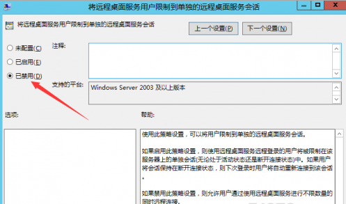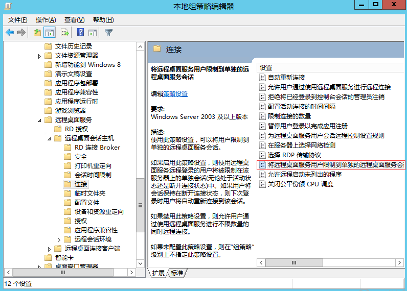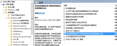 按照 计算机配置->管理模板->Windows 组件->远程桌面服务->远程桌面会话主机->连接 的路径,找到“将远程桌面服务的用户限制到单独的远程桌面会话”配置项: