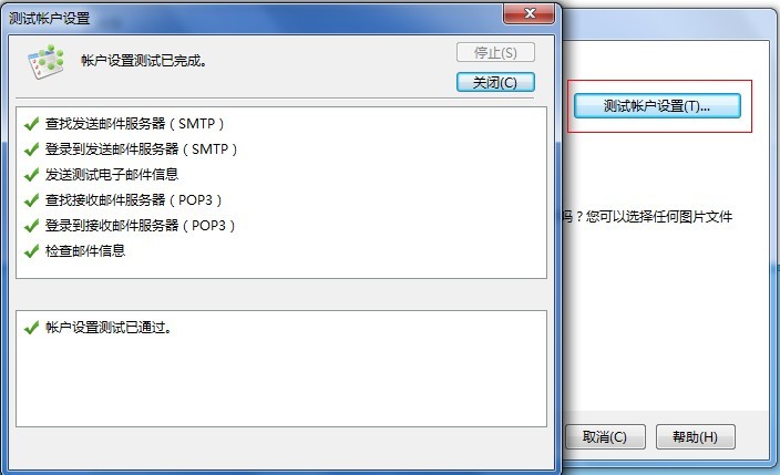 5、点击“测试帐户设置”,出现如下图“帐户设置测试已通