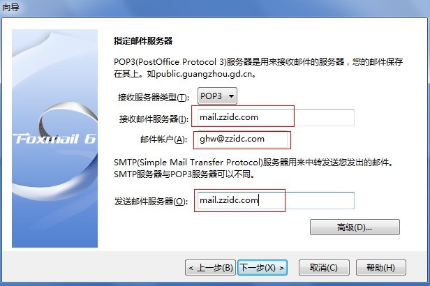 4、这里是最关键的,如下图,“接收邮件服务器”POP3和“发送邮件服务器”SMTP均填写为mail.yourdomain.com,“邮件帐户”填写为自己的邮箱全称,点击下一步