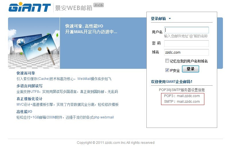1、 在http://mail.yourdomain.com登录界面就有SMTP和POP3 的设置信息,如下图:
