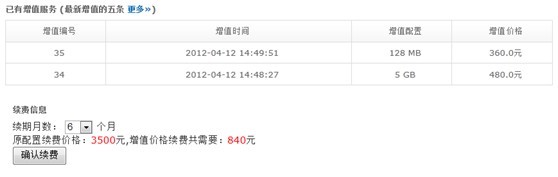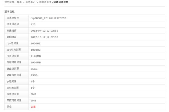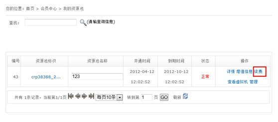 2、 续费界面中,显示该资源池的基本信息,已有增值服务,和续费信息三部分组成。续费信息有开通日期、到期日期以及资源池的当前配置等信息;已有增值信息中显示已有的增值服务信息,如果续费时,系统会自动计算加上增值服务后的续费价格,也就是续费价格=原配置金额+增值金额;续费信息中,选择续费月数。