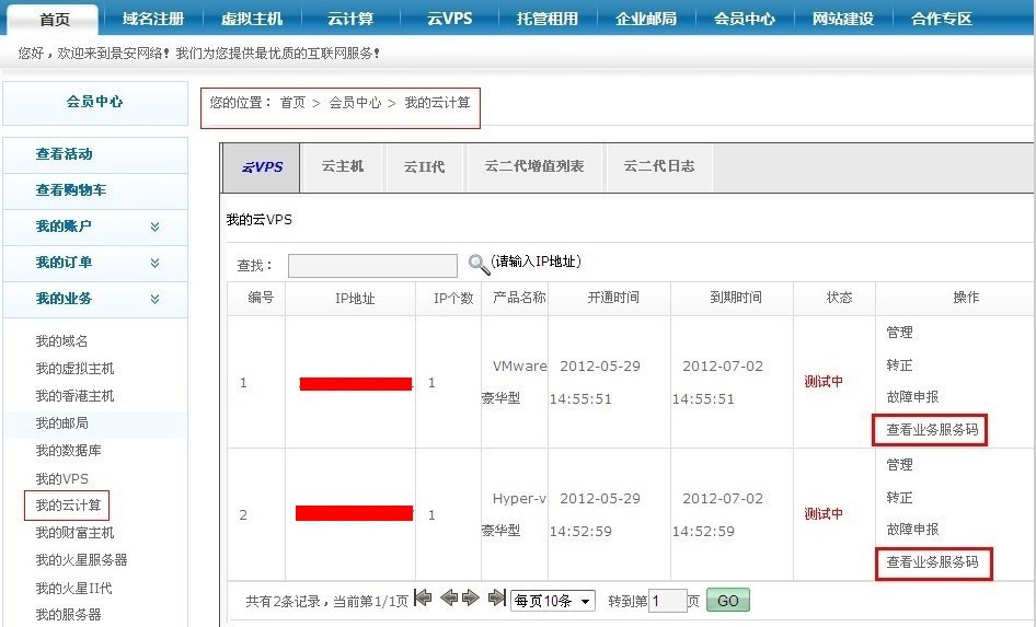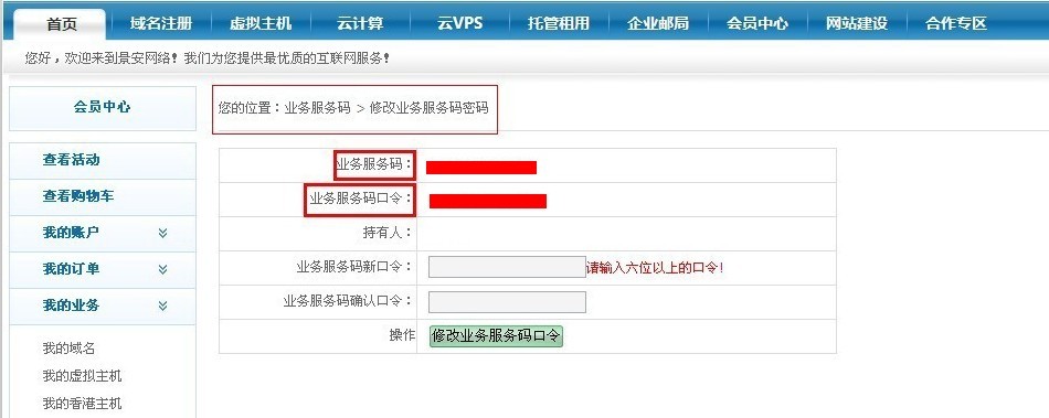 2、登录“会员中心”,在会员中心“我的业务”下拉列表中选择自己的业务