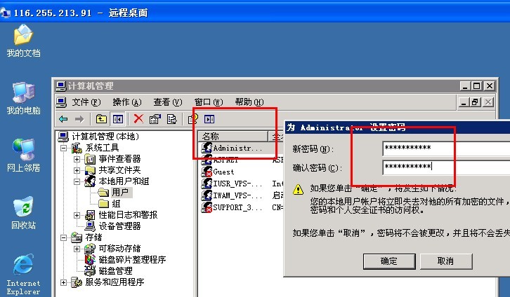 首次登陆请及时修改服务器密码:右击“我的电脑”—— 选择 “管理”—— 选择“本地用户和组”——单击“用户” ,右侧可以看到默认的系统帐号“Administrator” ——右健点击“设置密码” 来设置您自己的密码。如图