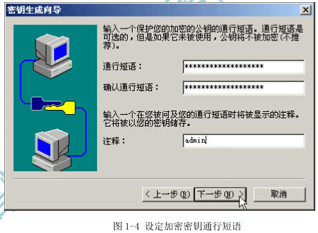 4)输入一个保护您设定的加密密钥的通行短语,如图1-4所示。