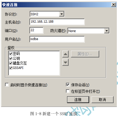在协议中选择 SSH2,在主机名中输入“192.168.12.188” ,在用户名中输入“ixdba” ,其他保持默认,如图 1-8 所示。