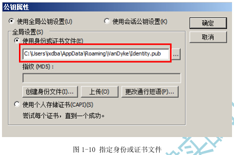 10)在出现的“公钥属性”窗口中,找到“身份或证书文件” ,即上面步骤 7)中生成的密钥文件,如图 1-10 所示。