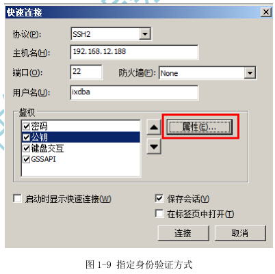 9)由于这里要让服务器使用RSA方式来验证用户登录SSH,因此在“身份验证”一栏中只需选择“公钥”方式,然后单击右边的“属性”按钮,如图 1-9 所示。