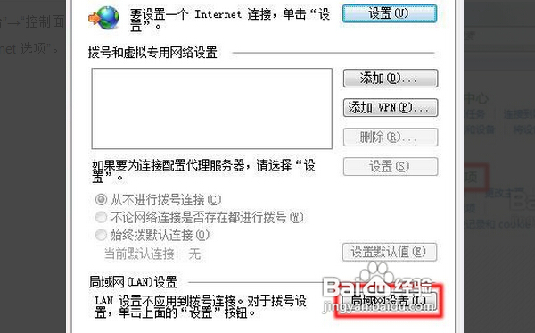 2.在“Internet选项”对话框下,点击“连接”选项卡,然后点击“局域网设置”按钮。