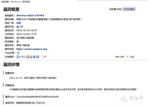 10月19日,乌云漏洞报告平台曝出“网易的用户数据库疑似泄露”影响数量总共近5亿条,泄露信息包括用户名、密码、密码提示问题/答案、生日等信息。