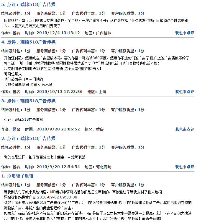 通过上图,我们可以看出网友们对于518广告联盟的看法了,评分都很低,骂声一片啊。建议大家还是谨慎选择吧!