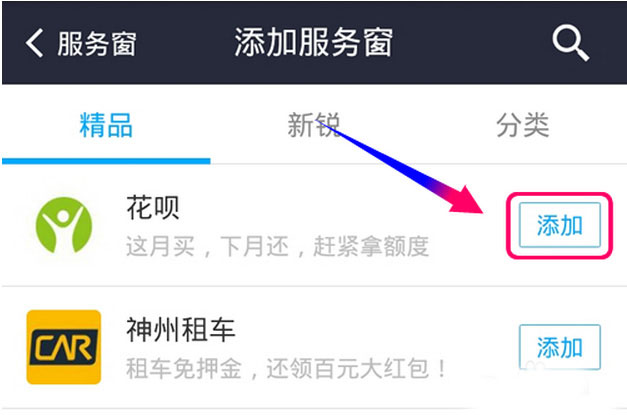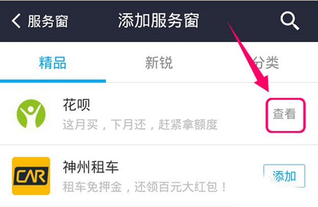 4.把花呗服务添加后,就可以点击查看进入花呗服务窗口