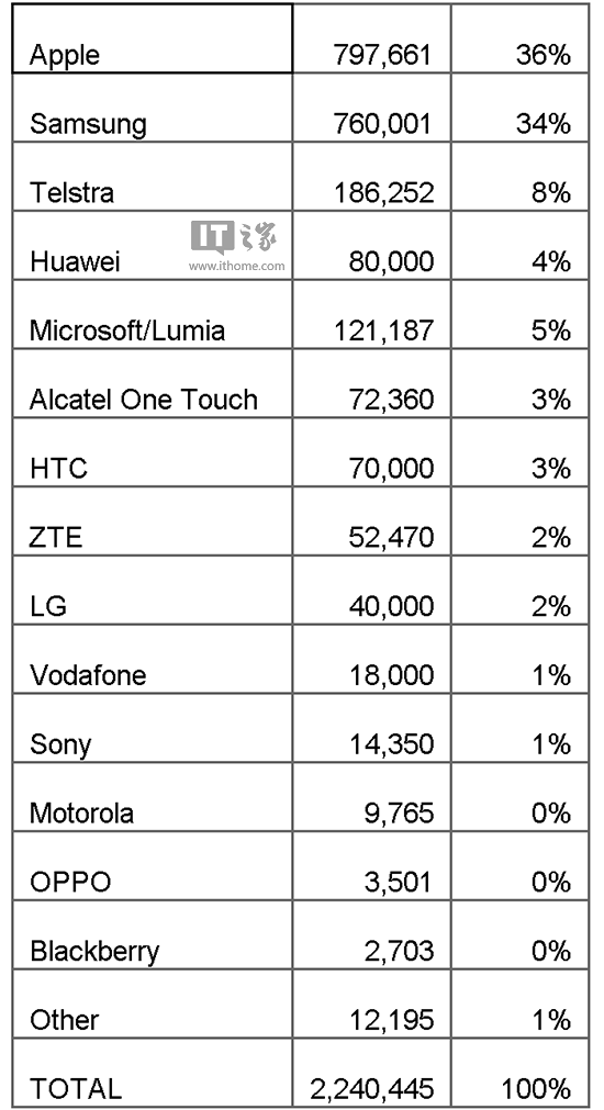 调查机构IDC发布澳大利亚2015年Q2智能手机市场数据统计,结果表明微软Lumia在澳大利亚市场份额为5%,手机销售量为121187部,在苹果、三星和澳洲电信之后。而澳洲电信售卖设备比较广泛。