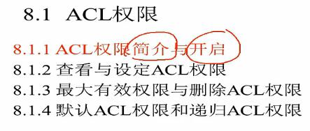 本章主要讲了ACL权限是干嘛的。其实ACL权限主要是解决所有者、所属组、其他人三个身份不同情况;我们还讲解了ACL权限的开启办法。