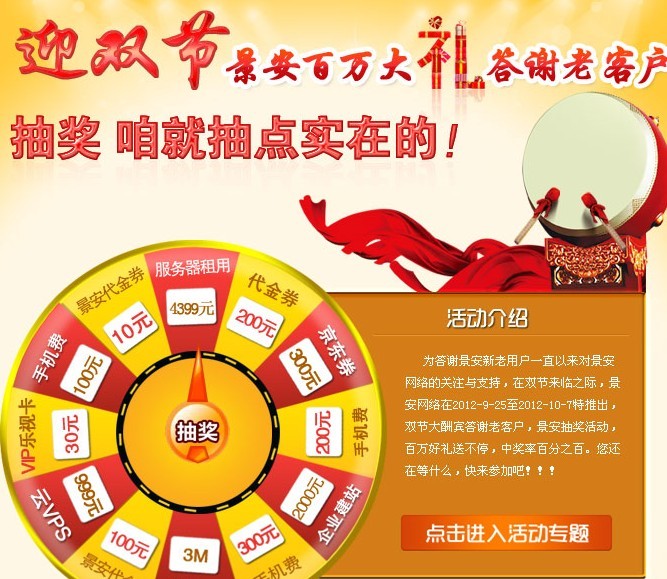 2012年中秋国庆双节即将到来,今年的双节,景安网络不走寻常路,斥资百万元答谢老客户,重金抽奖,只要是景安的会员,都有机会参与抽奖,奖品丰富多样,价值不菲,尤为重要的是,中奖率!