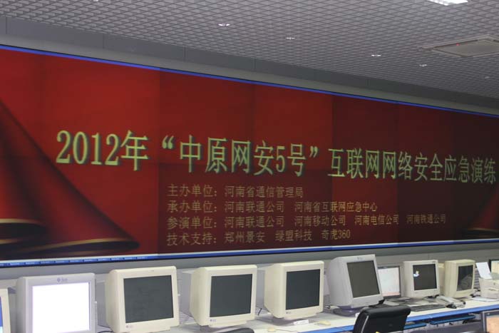 为进一步加强河南公共互联网网络安全应急管理工作,增强对党的“十八大”等国家重大活动的网络安全保障能力,由河南省通信管理局主办、河南联通公司及河南省互联网应急中心组织承办的“中原网安5号”互联网网络安全应急演练,于9月29日10时30分在河南联通大厦举办,河南四大电信运营商参演了应急演练。由景安网络、绿盟科技以及奇虎360三家网络公司提供技术支持。