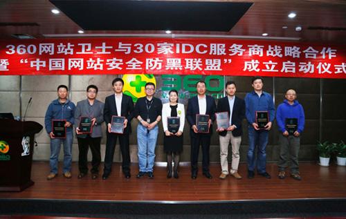 (图为360副总裁谭晓生为知名IDC颁发安全防黑联盟证书,右四为景安网络CEO杨小龙)