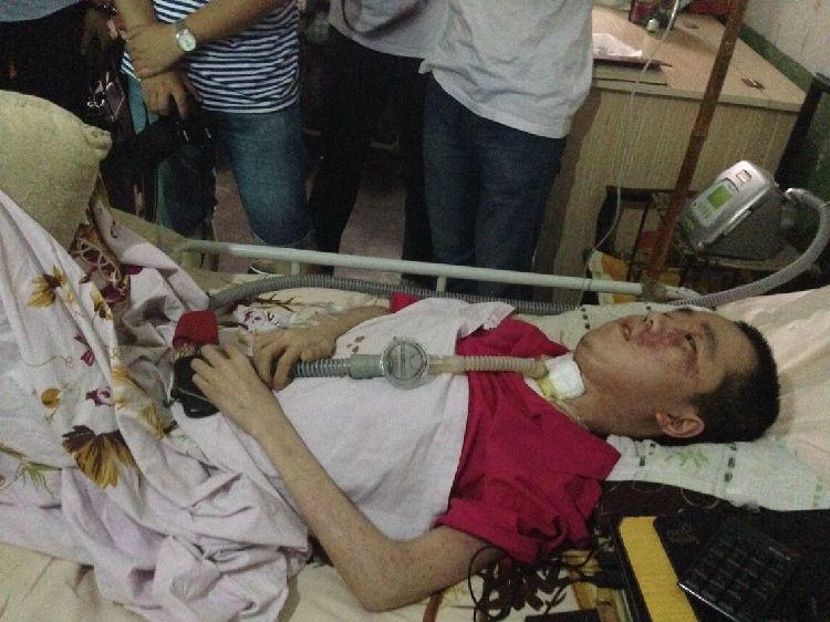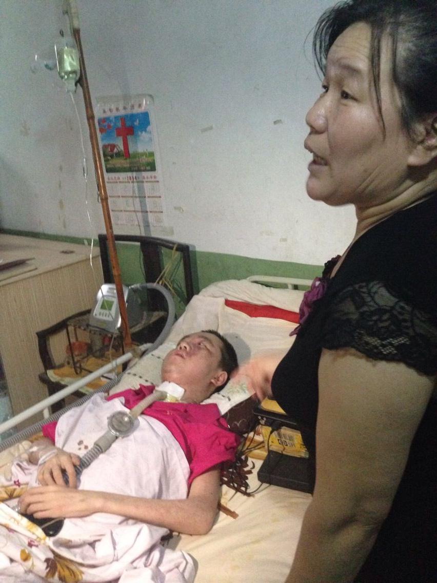 原志亮躺了13年的屋子光线昏暗,只有一个灯泡发出微弱的光。一条连接着呼吸机的塑料管道直插进原志亮的脖子上,房间里响着呼吸机发出的单调声音。