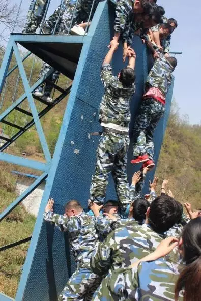 面对一面高达4.2米的逃生墙,集体惊呼不可能翻越。在教练下达15分钟内要全部逃生的命令后,小伙伴时间冲到墙下,搭起人梯。秉着不抛弃、不放弃,团结一心、全力以赴的信念,大家只用了10分钟全部人员成功逃生。